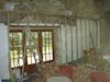 Inside framing and plaster boarding conservatory. Outside trees and woods. |